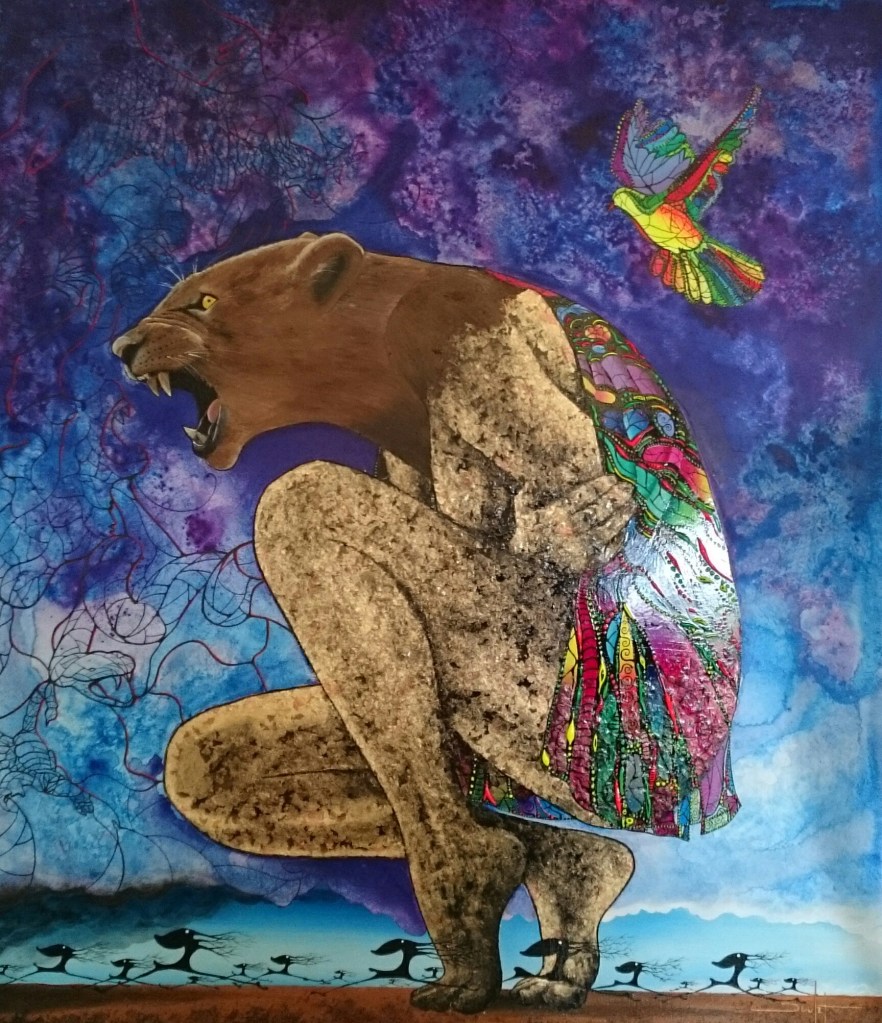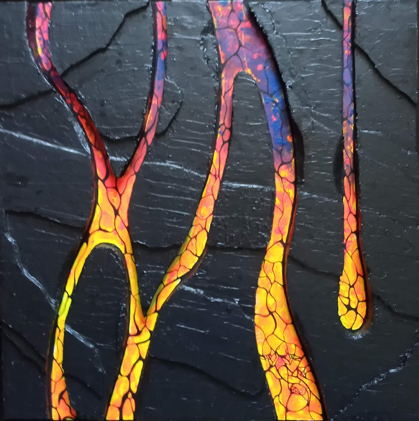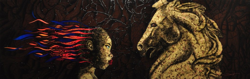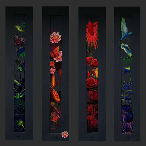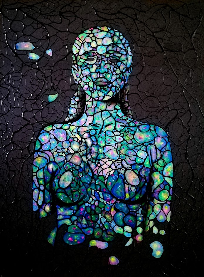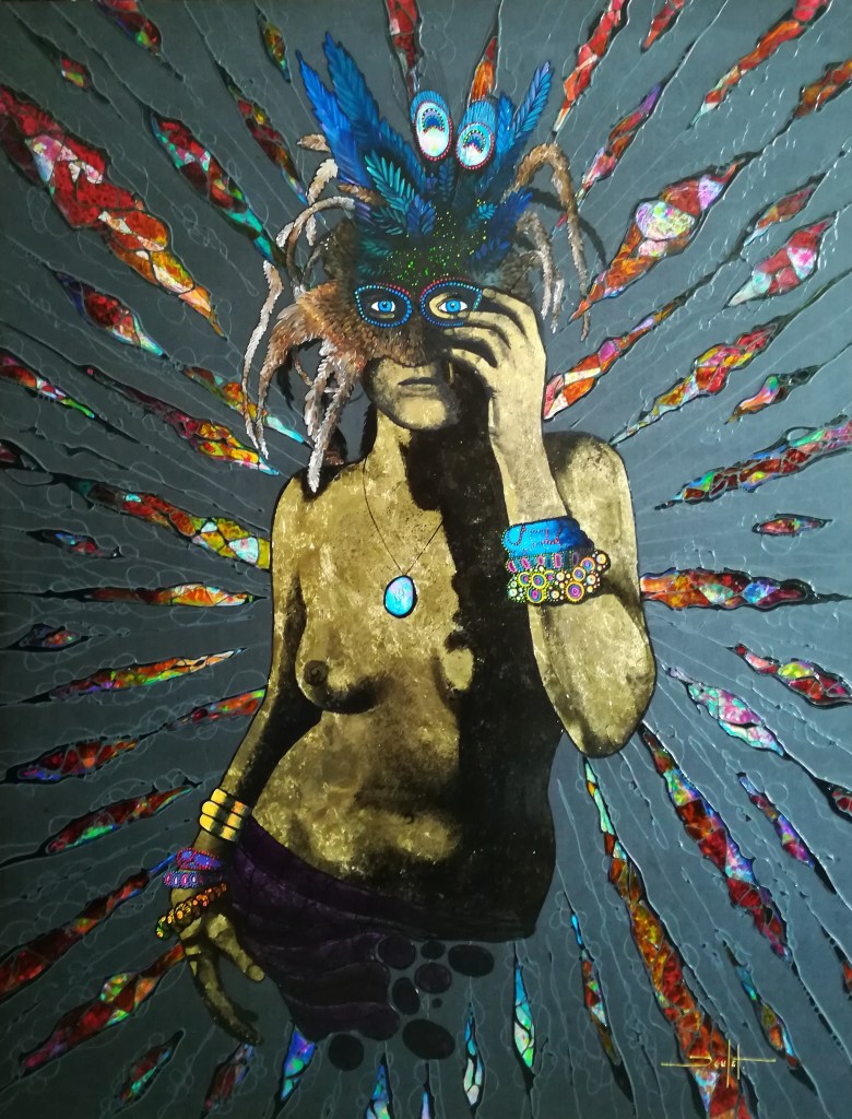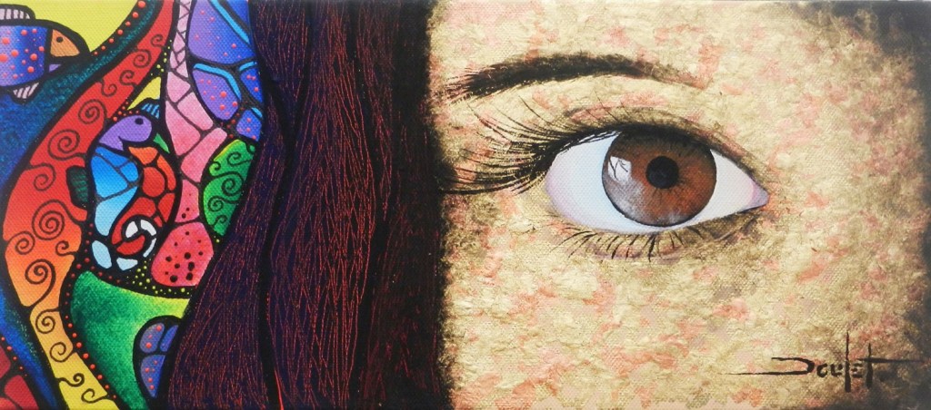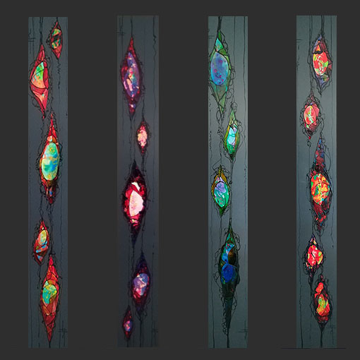 Sur le plan de la technique, je développe un travail qui s’approche d’un effet vitrail en surlignant les différents espaces de mes toiles.