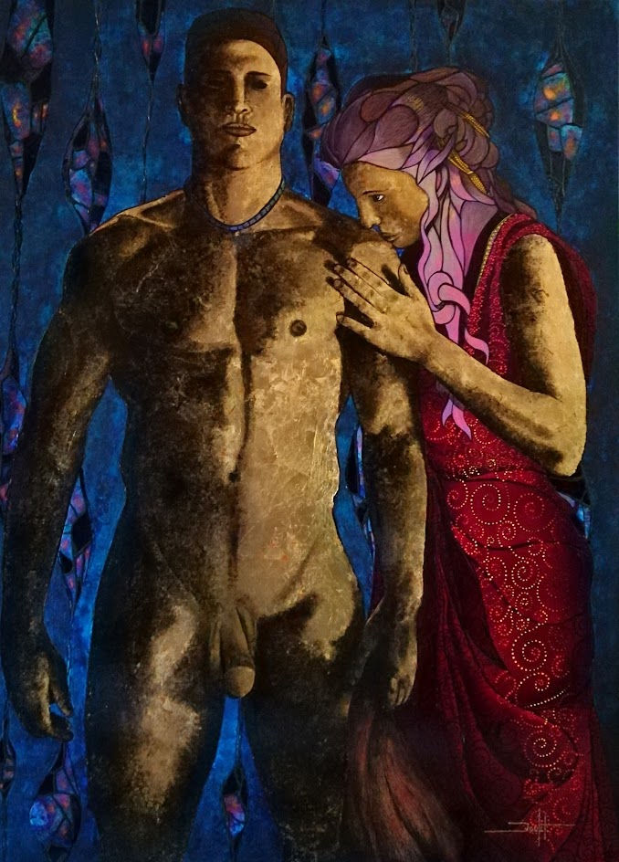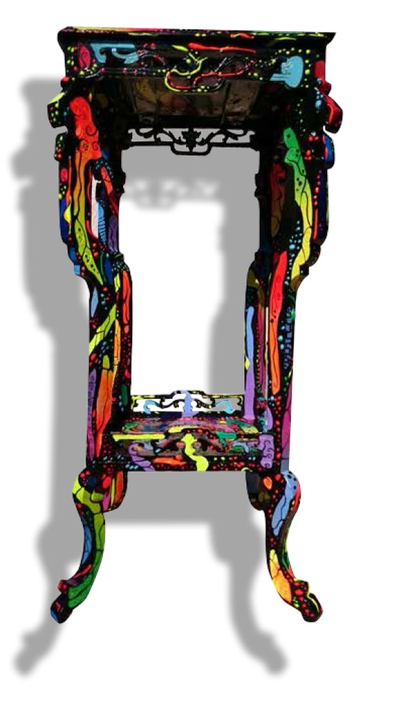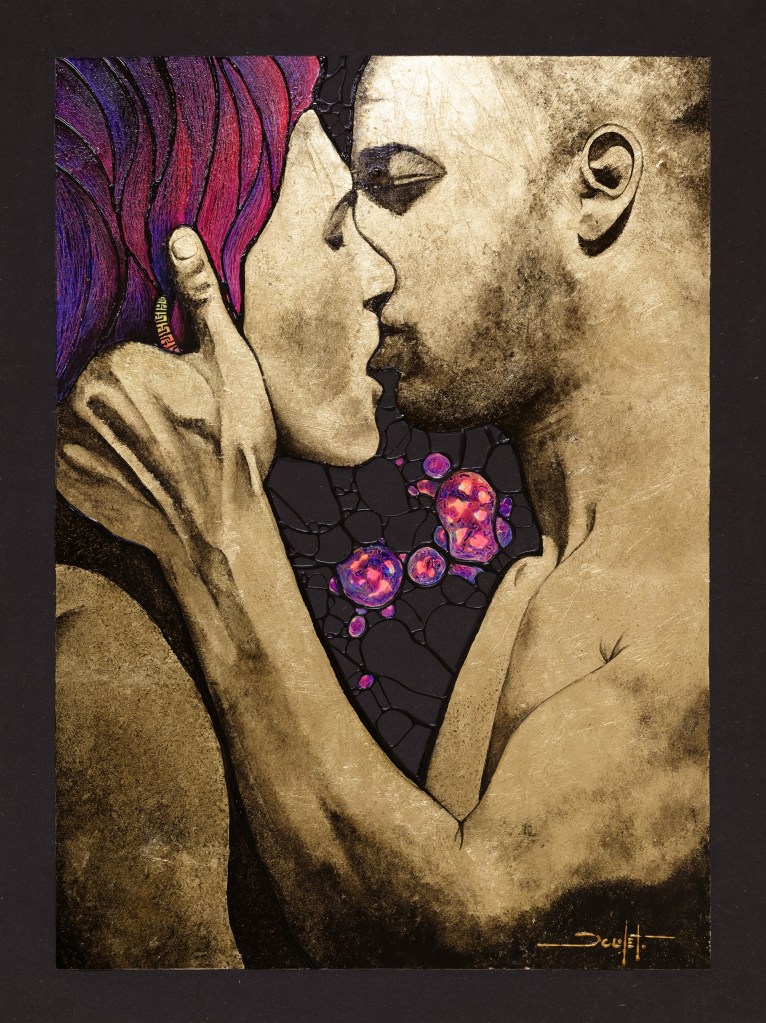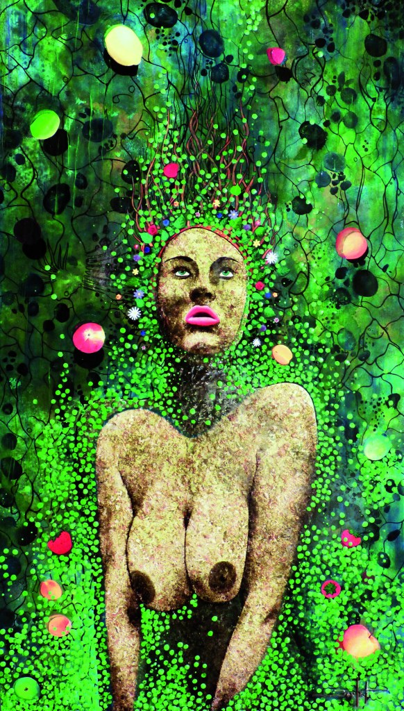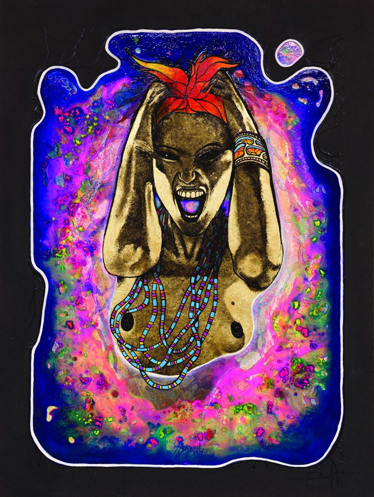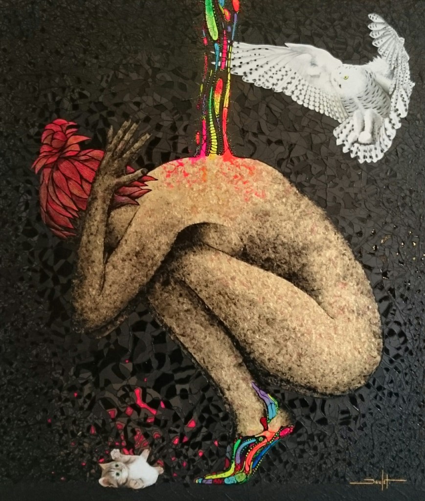 Sur le plan de la technique, je développe un travail qui s’approche d’un effet vitrail en surlignant les différents espaces de mes toiles.